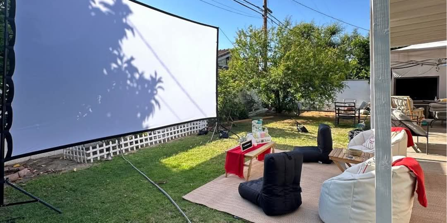 MOVIENITE offers a complete outdoor movie screening experience that includes a projector, screen, speakers, comfortable seating like luxe bean bag chairs, and themed decor. We also provide a lighted concession stand complimentary snacks to enhance your viewing experience.